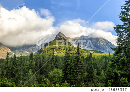 Polish Tatra mountains summer landscape with blue sky and white clouds.