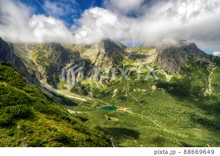 Peaks and Bielovodska valley in High Tatras mountains, Slovakia. Colorful sky