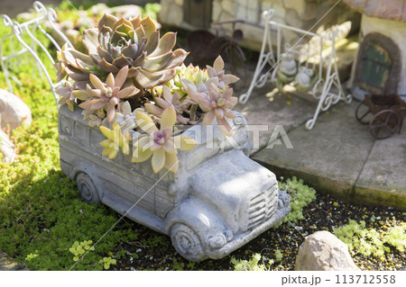 ガーデニングイメージ 車のプランターに寄せ植えした多肉植物