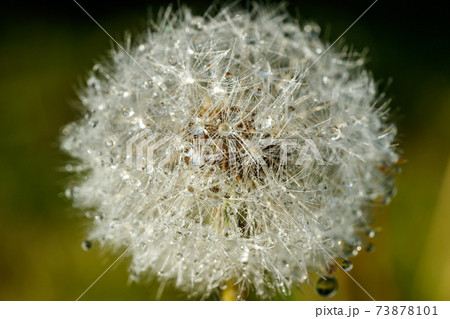 Beautiful fluffy dandelion with seeds under the rain against the green grass