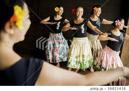 南国の雰囲気たっぷりでオリタヒチを楽しそうに踊る日本の若い女性