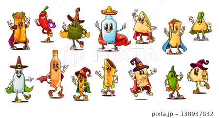 Cartoon Halloween tex mex food wizard and mage characters. Vector tequila, tacos, burrito or jalapeno pepper. Enchiladas, avocado or pulque and mezcal. Nachos, tamales, quesadilla and churros warlocks