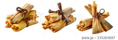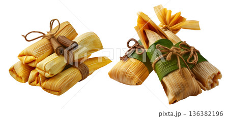 Peru Corn tamales with meat filling and steamed vegetables, wrapped in corn husks, isolated on white background