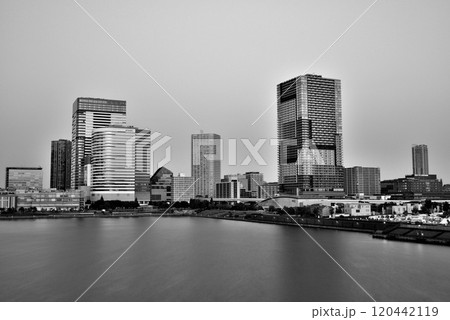 晴海大橋から観たららぽーと豊洲高層マンションの夕景 モノクロ