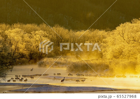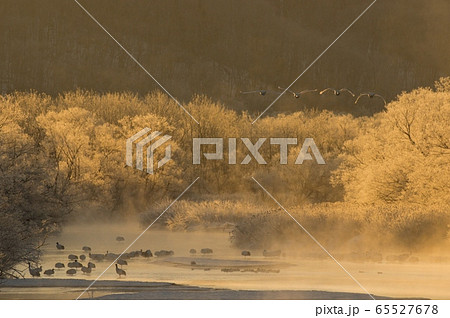 タンチョウの朝 氷の花が咲く雪裡川