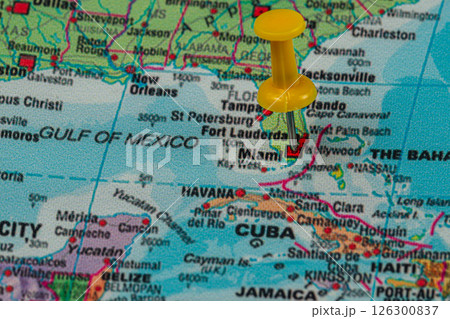 Bright yellow pushpin marks Miami on a detailed map of Florida