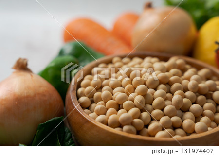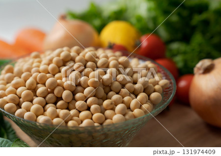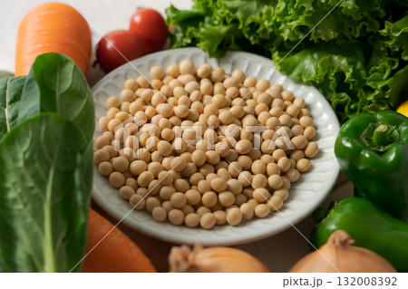 器に入った大豆とたくさんの野菜