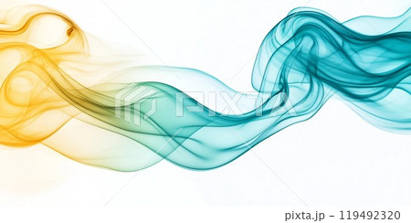 抽象背景横長テンプレート。黄色とターコイズグリーンの透明感のある波がある空間。AI生成画像