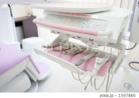 暖色、ピンクのモダンなデザインの歯医者さんの診察台・チェア、歯科診療ユニット、機材フルセット