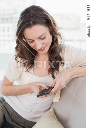 Cute blonde woman relaxing with her laptop while sitting on a so