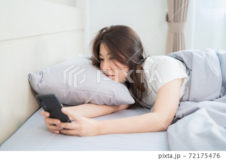 beautiful woman using mobile phone video call on the bed in the bedroom