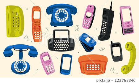 Vintage phones. Cartoon retro telephone devices and cell phones, antique wired dial communication equipment, old phone icons flat style. Vector isolated phones collection