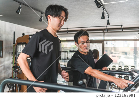 ランニングマシンで有酸素運動をする男性と指導するパーソナルトレーナーの男性