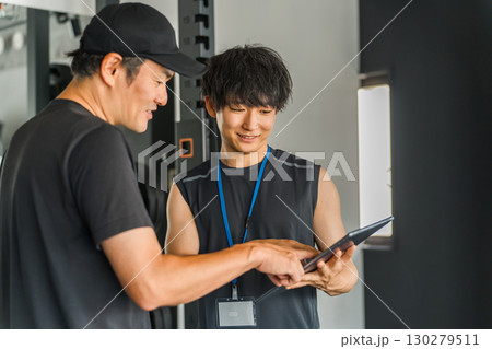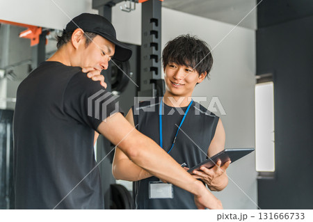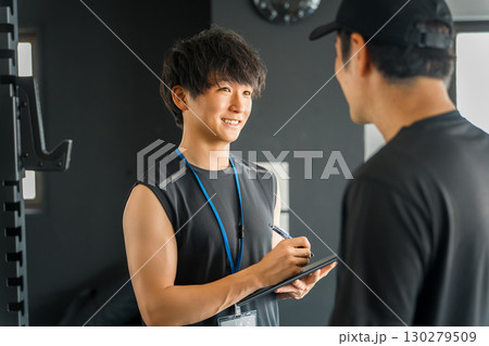 パーソナルジムで会員に個別指導するトレーナーの男性
