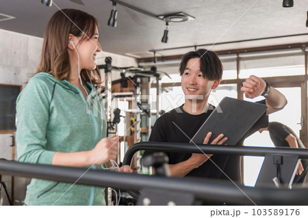 ランニングマシンで走る・ジョギングする女性と指導するパーソナルトレーナー・ダイエットコーチ