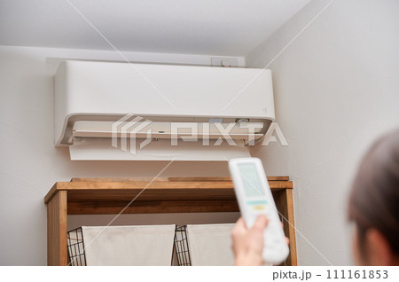 エアコンを操作する女性 リモコン