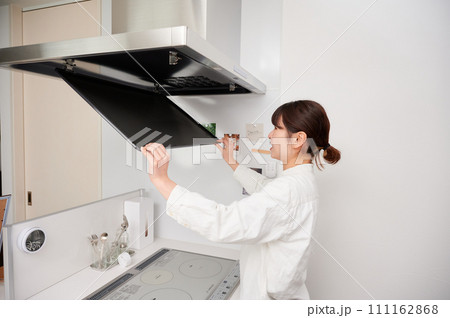 レンジフードを掃除する女性 換気扇 キッチン