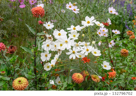 Vibrant orange and white spring flowers top view closeup, radiant floral pattern, fresh blooming nature background, cheerful seasonal garden texture