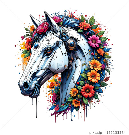 Elegant cyborg horse head with sleek white metal plating, contrasting beautifully with a colorful, lush floral wreath and paint splatters.