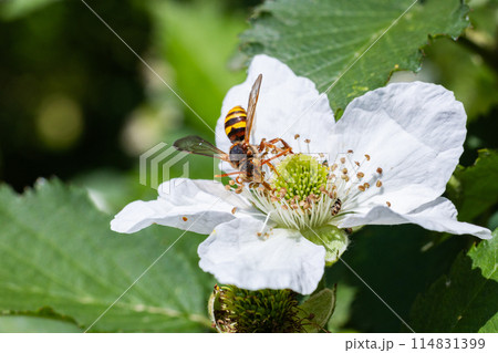 ブラックベリーの花の蜜を吸うダイミョウキマダラハナバチ