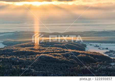 寒さ厳しい北海道の冬の朝に見られるサンピラー