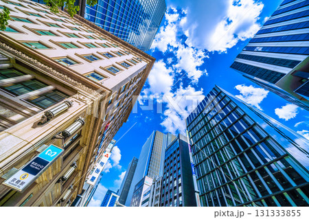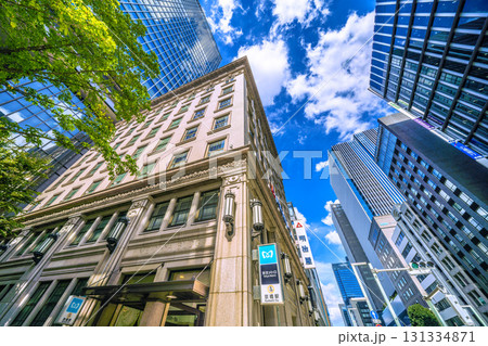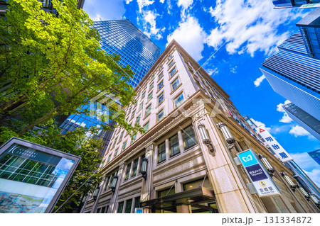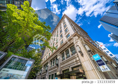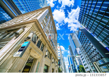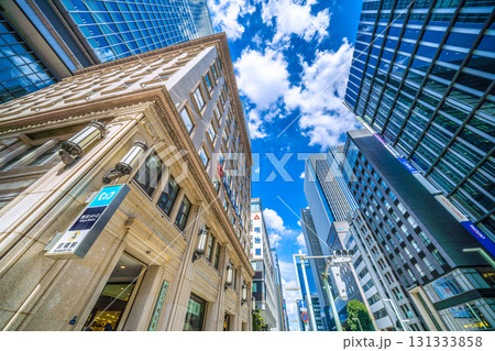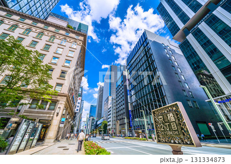 日本の東京都市景観 京橋のオフィス街。明治屋京橋ビルにある京橋駅出入口などを望む