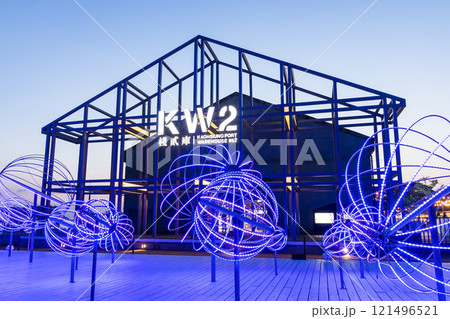 Night mural art and installation art view of Pier-2 Art Center in the port of Kaohsiung, Taiwan.