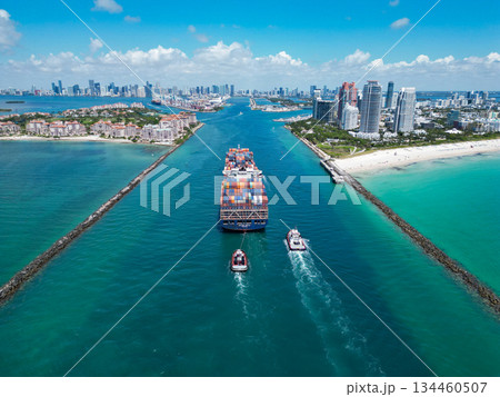 Miami, Florida, USA - June 06, 2024: Cargo ship barge in Miami Biscayne bay. Miami marina bay view. Cargo ship in Florida. Miami beach with barge in Biscayne bay