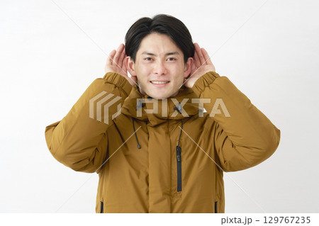 ダウンジャケットを着た男性 耳に手を当てて聴く 白背景