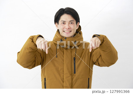 ダウンジャケットを着た男性 懇願 白背景 カメラ目線