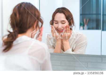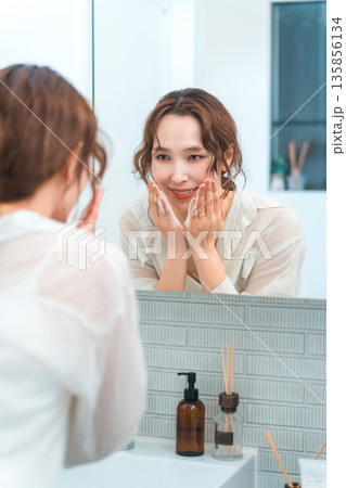 洗面所で洗顔する主婦のアジア人女性(メイク落とし,クレンジング,泡洗顔)