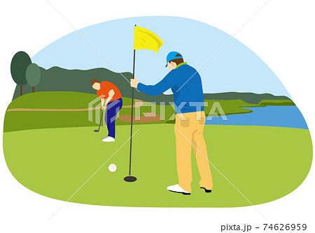 グリーンでパッティングする男性ゴルファーとピンを持つ同伴ゴルファー(背景なし)