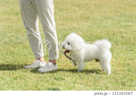 犬の散歩・散歩・外気浴をする飼い主とビションフリーゼ