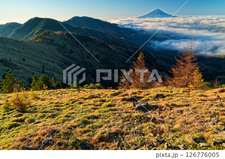 秋の大菩薩嶺稜線から見る早朝の富士山