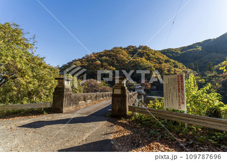 美しい間瀬湖の堤体上を歩く入口 埼玉県本庄市
