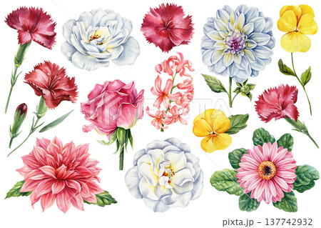 Watercolor flower clipart set with carnation dahlia rose gerbera pansy and white rose isolated botanical collection