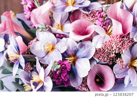 bouquet of flowers wrapped in purple paper. bouquet in shades of pink, purple and white lilies, tulips and other small flowers. floral card. Mothers day, International Women's Day