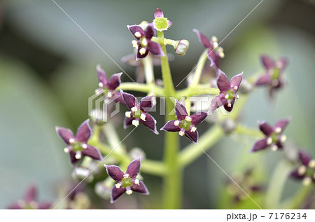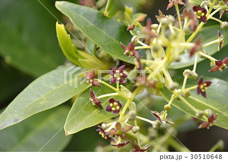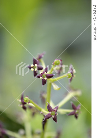 目立たない花・アオキの雄株の紫褐色の雄花・横位置