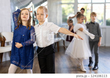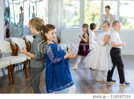 Happy preteen children practicing ballroom dances in pairs in training hall