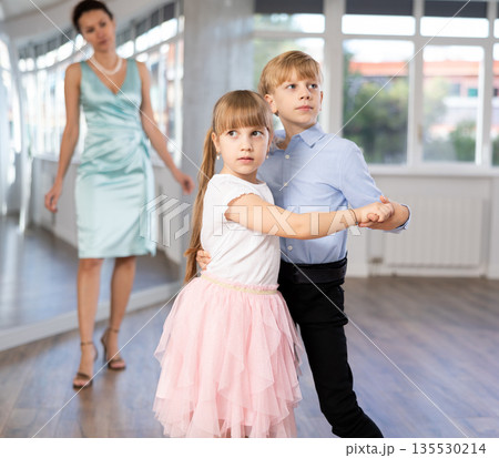 Preteen boy and girl refining slow foxtrot technique in dance hall