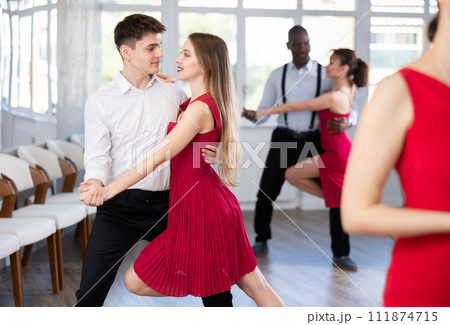 Young positive multinational people dancing together slow ballroom dances in pairs in ball room at dance salon