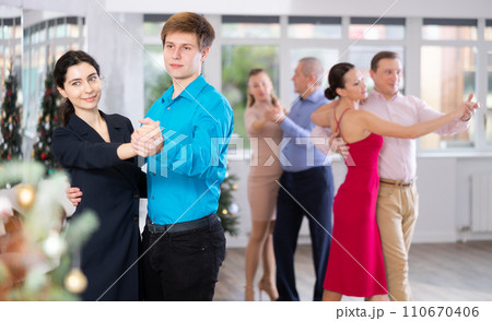 Positive men and woman dancing slow ballroom dance during group class in dance studio