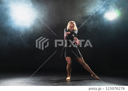 Contemporary woman dancer posing on black background with smoke. Adult female artist performer dancing with expression. Modern ballerina dancing in darkness. Passion dance in dark. Flexibility balance