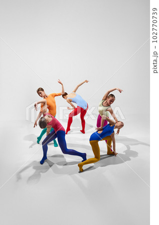 Group of young girls, ballerinas in multicolored clothes making performance, dancing against grey studio background