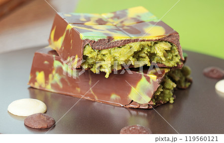 Dubai chocolate bar with pistachio paste and kataifi dough. Confectionery and sweets.