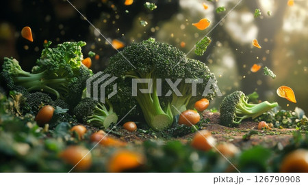 Vibrant Green Broccoli and Orange Vegetables in Motion