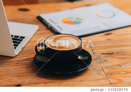 Closeup of coffee cup on table in empty corporate conference room before business meeting in office