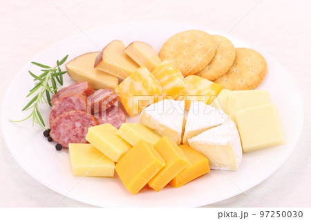 オードブル 盛り合わせ サラミ チーズ クラッカー 明るい背景