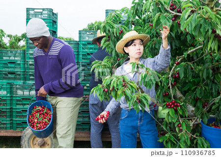 Group of focused farm workers harvesting organic cherry