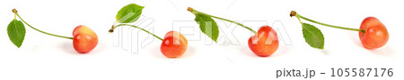 Collection of light red different sweet cherries with green leaf, side view isolated on white. Extrem close-up.